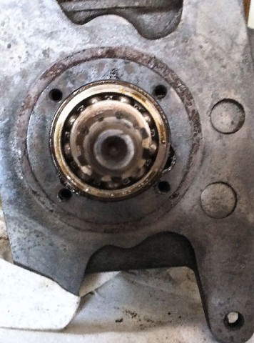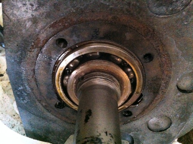 Does. The input shaft move in and out ? In the first picture the clutch gear appears more forward also the inner race looks like it has some scoring on the front. Spray it down with some carb cleaner and put more light on it and post a pic. Also clean the inside of the bearing retainer and post a pic of the back.