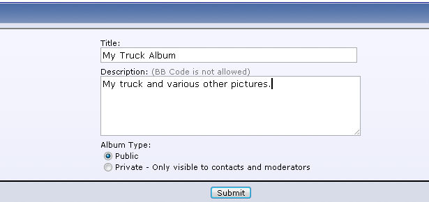 To create your own picture albums and enjoy the same fame follow the steps below. Browsing Users are allowed 10 pictures maximum, Registered Users and Donators are allowed 100, Site Supporters are allowed 1000, and Extreme Supporters are allowed 2000. There are 11 steps including tips. Step 1 Click the Picture Albums link at the top of the forum. http://6066gmcclub.com/forum/picture...&pictureid=649 Step 2 Click on the link titled "Create New Album" on the right. http://6066gmcclub.com/forum/picture...&pictureid=650 Step 3 Give your new album a title and optional description. Select your album's privacy. Only Public albums are shown on the main page. Click Submit to begin album creation. http://6066gmcclub.com/forum/picture...&pictureid=651 Step 4 Click on any of the three links to upload your photos. All links on this page are interchangeable. http://6066gmcclub.com/forum/picture...&pictureid=652 Step 5 Clicking on the choose buttons will allow you to browse your computer. You may choose up to 5 pictures. http://6066gmcclub.com/forum/picture...&pictureid=653 Step 6 Browse to your picture and select Open. http://6066gmcclub.com/forum/picture...&pictureid=654 Step 7 Click the Upload button. http://6066gmcclub.com/forum/picture...&pictureid=655 Step 8 The next page has several options. If you are happy you may simply click Save Changes to continue. Here you may give your picture a caption, move it to a different album if you have created several, set your picture as the album cover, or delete the picture entirely. http://6066gmcclub.com/forum/picture...&pictureid=656 Step 9 To add more pictures to an album click on Upload Pictures. If you are finished simply navigate away from the page. Your pictures will show up in the forum rotation momentarily if they are public. http://6066gmcclub.com/forum/picture...&pictureid=657 Step 10 Alternatively, you may choose to edit your images and album settings by clicking the link to the right of your album. http://6066gmcclub.com/forum/picture...&pictureid=658 Step 11 To post a link to a picture in your album click on the picture, then copy the BBCode shown under the picture. http://6066gmcclub.com/forum/picture...&pictureid=659 As always PM me if you have problems and I will be glad to help. :smileGMC2: |