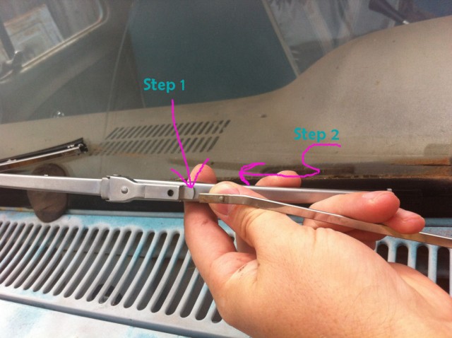 This may not be the right category, but I already feel like an idiot for having to ask about this, so I am not worrying about placement. How do I remove the wiper blade from the wiper arm on my 1964 K1500 GMC pickup? I have removed the wiper arm from the truck, but still can't figure out how to get the arm and blade apart. They are both expensive, so I don't want to ruin my originals. It looks like I need something that will slip over the end of the arm, but can't find a tool that will go into the small slot on the blade frame.